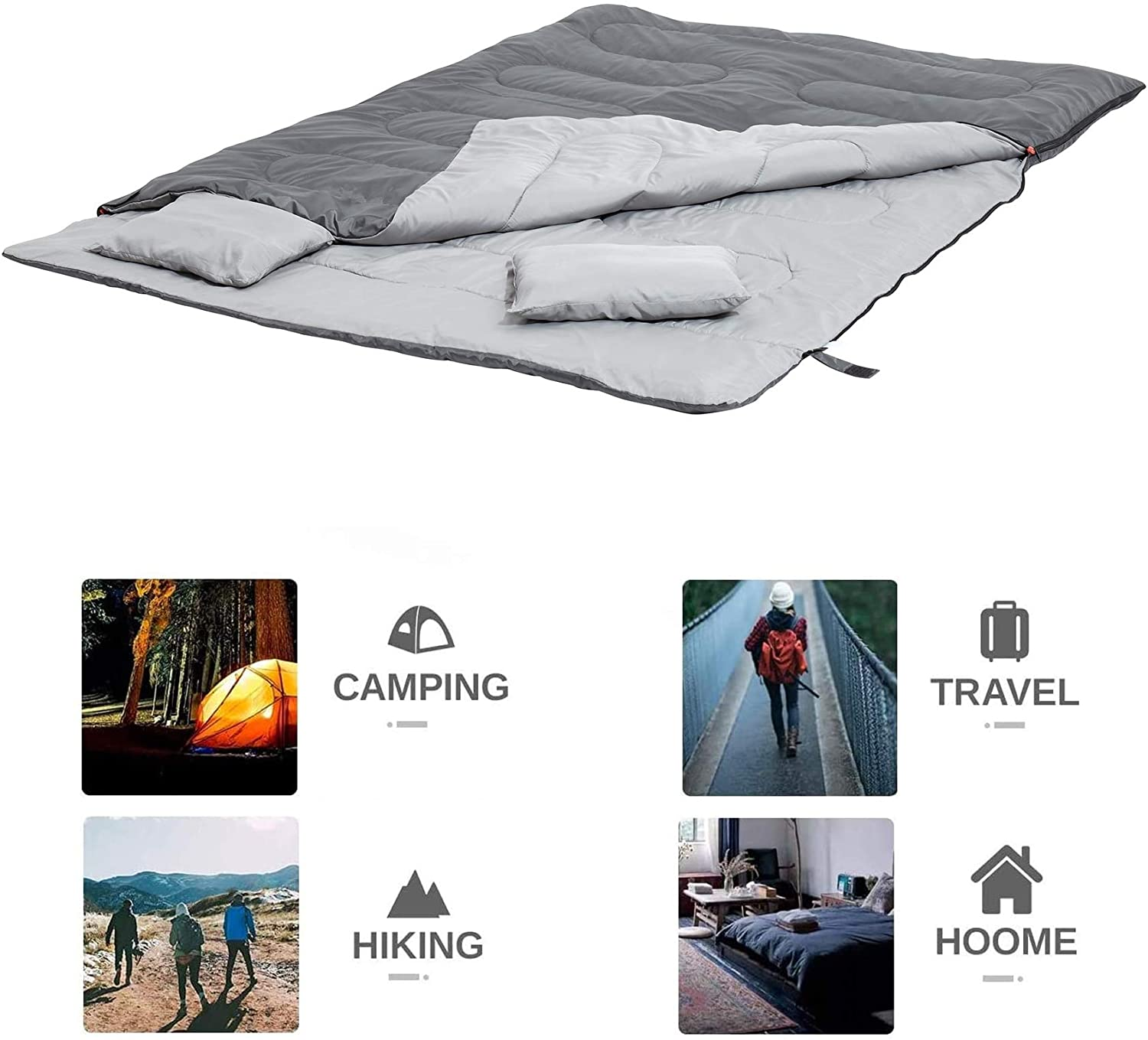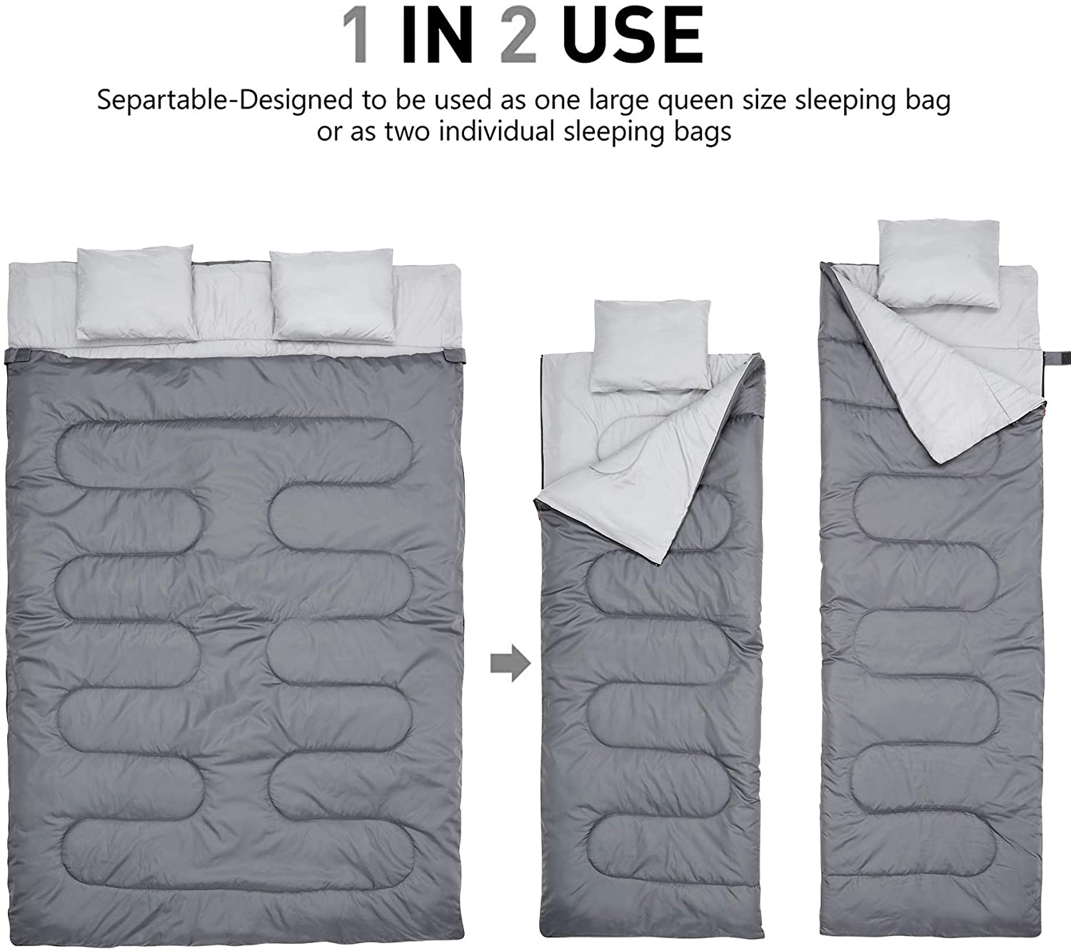 3.VERSATILE DESIGN:  Can be used as a single extra-large sleeping bag for doubling up, or it can be split into two separate sleeping bags. Features zippers on both sides so that either person can easily get out of the sleeping bag without disturbing the other person. Can also be fully unzipped and laid flat, turning the sleeping bag into two separate large blankets.